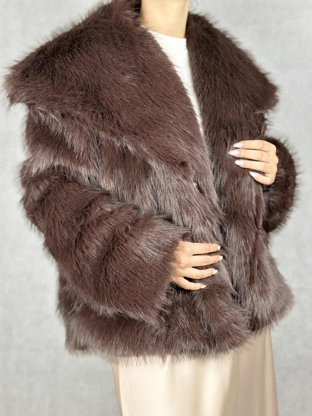 Елегантно кафяво пухено палто